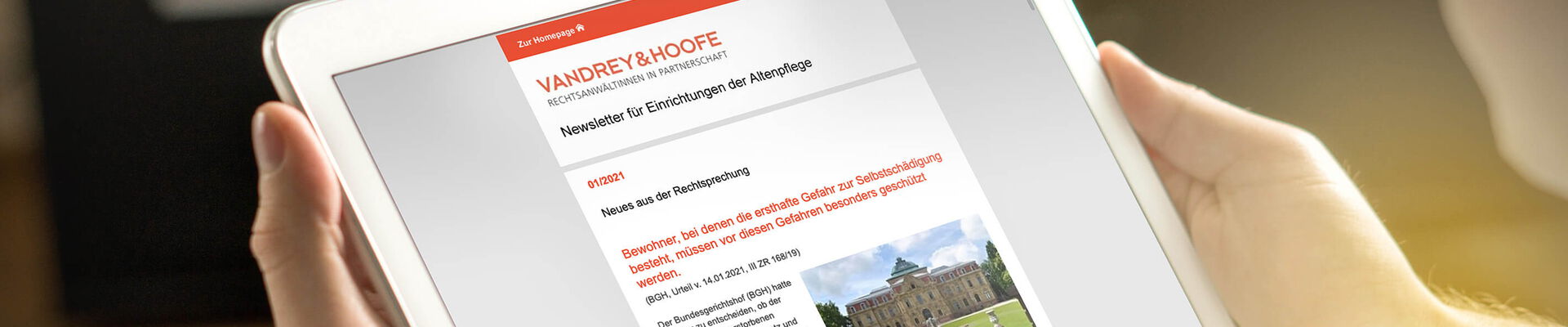 Viermal pro Jahr versenden wir an Einrichtungen der Behindertenhilfe und Altenpflege Informationen zu aktuellen Urteilen und Gesetzesvorhaben sowie praktische Tipps aus allen für die Einrichtungen relevanten Rechtsgebieten per Newsletter.